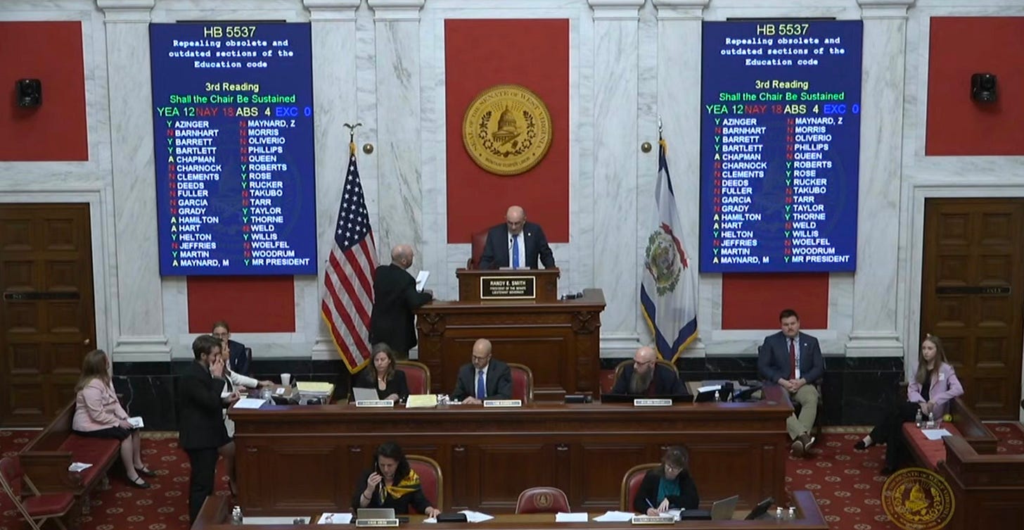 What happened next is worth pausing on. Senate President and Lt. Gov. Randy Smith (R-Preston) ruled the amendment non-germane, which under normal circumstances would have ended the conversation entirely. Sen. Weld challenged the ruling directly. Eighteen senators then voted to override their own Senate President, a parliamentary maneuver so rare in the West Virginia Legislature that most members who have served multiple terms have never seen it executed successfully. The presiding officer of the Senate was overruled by the body he presides over, on a bill about protecting children from abuse, with less than 24 hours left in the session. That is not a procedural footnote. That is the West Virginia Senate doing something genuinely difficult and institutionally significant because its members believed the stakes required it. Smith himself, notably, voted in favor of the measure after his ruling was overturned. The amended bill passed 24-7.